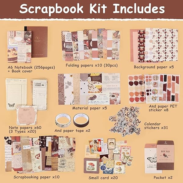 VINTAGE JOURNAL SUPPLIES KIT: Comes With A6 Grid Notebook – 256 Pages, Vintage Poster Book Cover, PET Sticker X 8 Sheets – 179 Pcs, Note Paper X 60 (3 Types X 20), Envelope X 2 (5.1in X 3.34in), Scrapbook Paper X 20 (10 Sheets: 6.5in X 3.15, 5 Sheets – 5.9in X 5.9in, 5 Sheets – 8.34in X 6.3in), Folding Label X 10 (6.6in X 1.77in), Card X 15, Paper Photo Frame X 5, Calendar Stickers X 31, Washi Tape X 2 (0.4in X 78.8in). This Kit Have Everything You Will Need!
