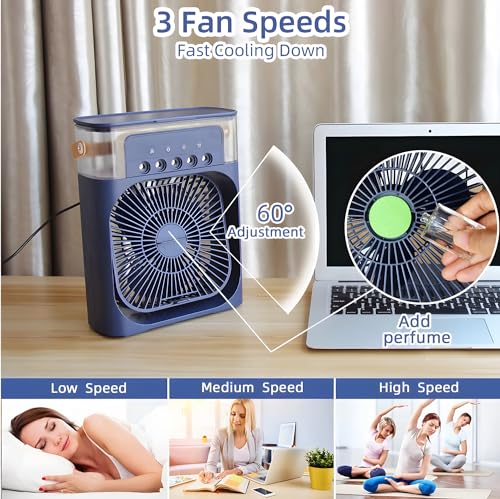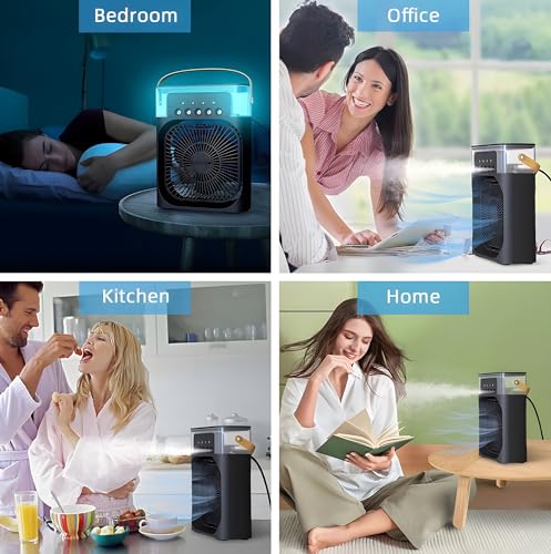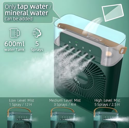 Fast Cooling Down & Personal Air Cooler & Air Humidifier – Portable Cooling Fan with strong wind, 5 spray humidification modes and 600ml water tank design, which can effectively provide cool air flow where you need it most. What the best is adding ice water to make it a mini air conditioner, giving you moist and fresh cold air. Cools you down in seconds in a hot kitchen, bedroom or office. Not only can humidify the air, but also drive cool air circulation in your room.