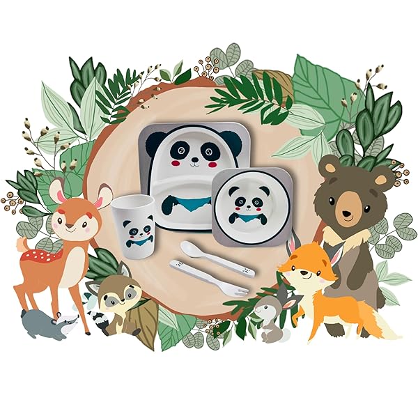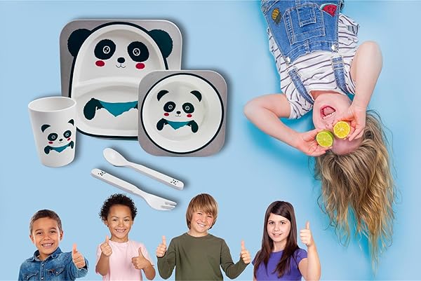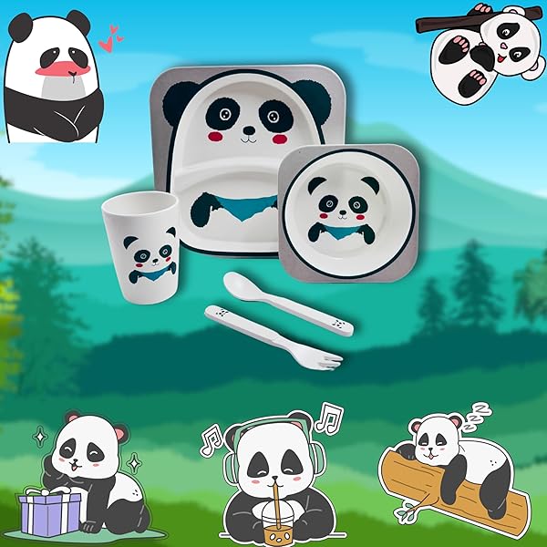 24×7 eMall Kids Bamboo Baby Tableware, Eco Friendly Bamboo Fibre Dinner Set for Toddler and Kids, Self-Feeding Baby Utensil Set of 5pcs, 1 x Plate, 1 x Bowl, 1 x Glass, 1 x Spoon, 1 x Fork Panda