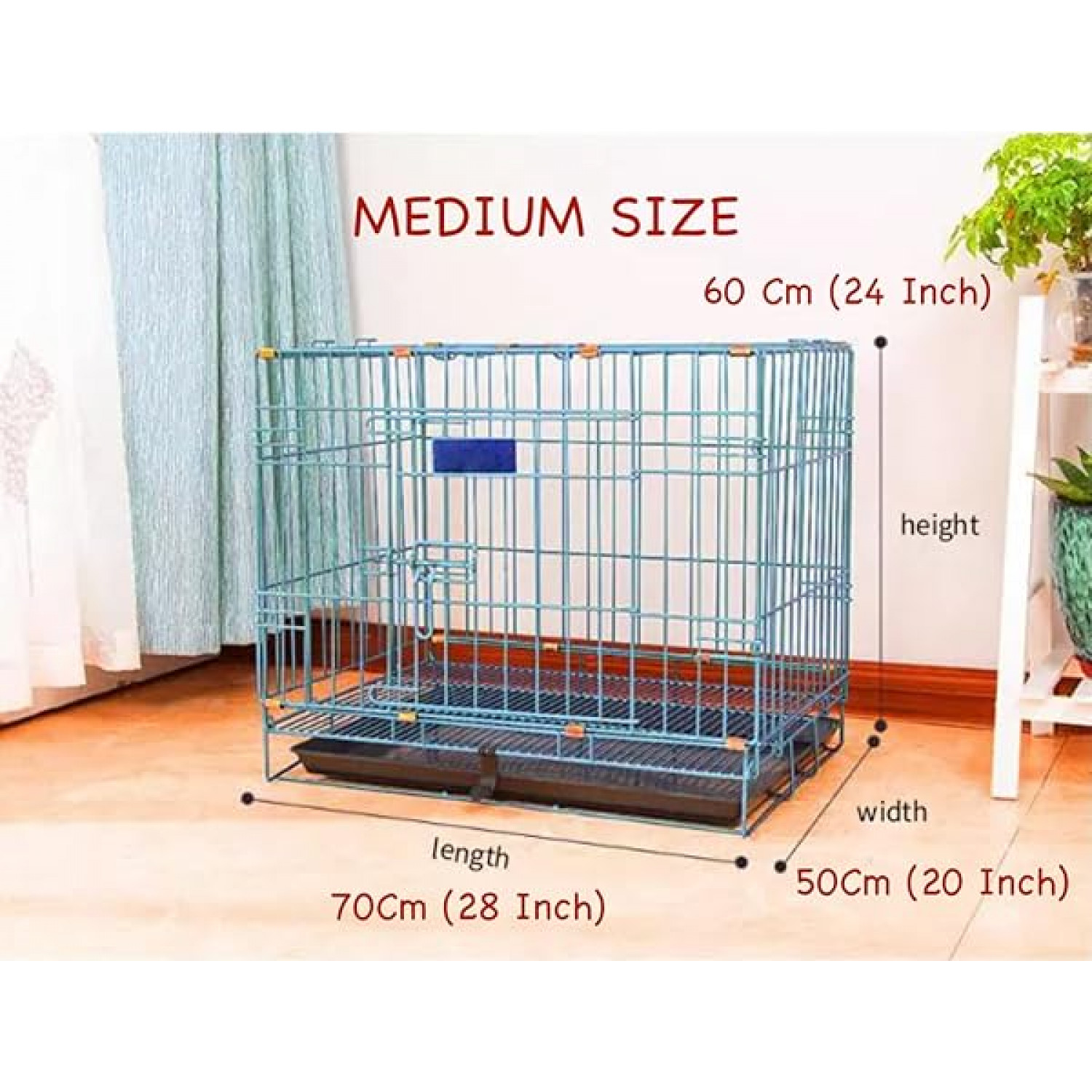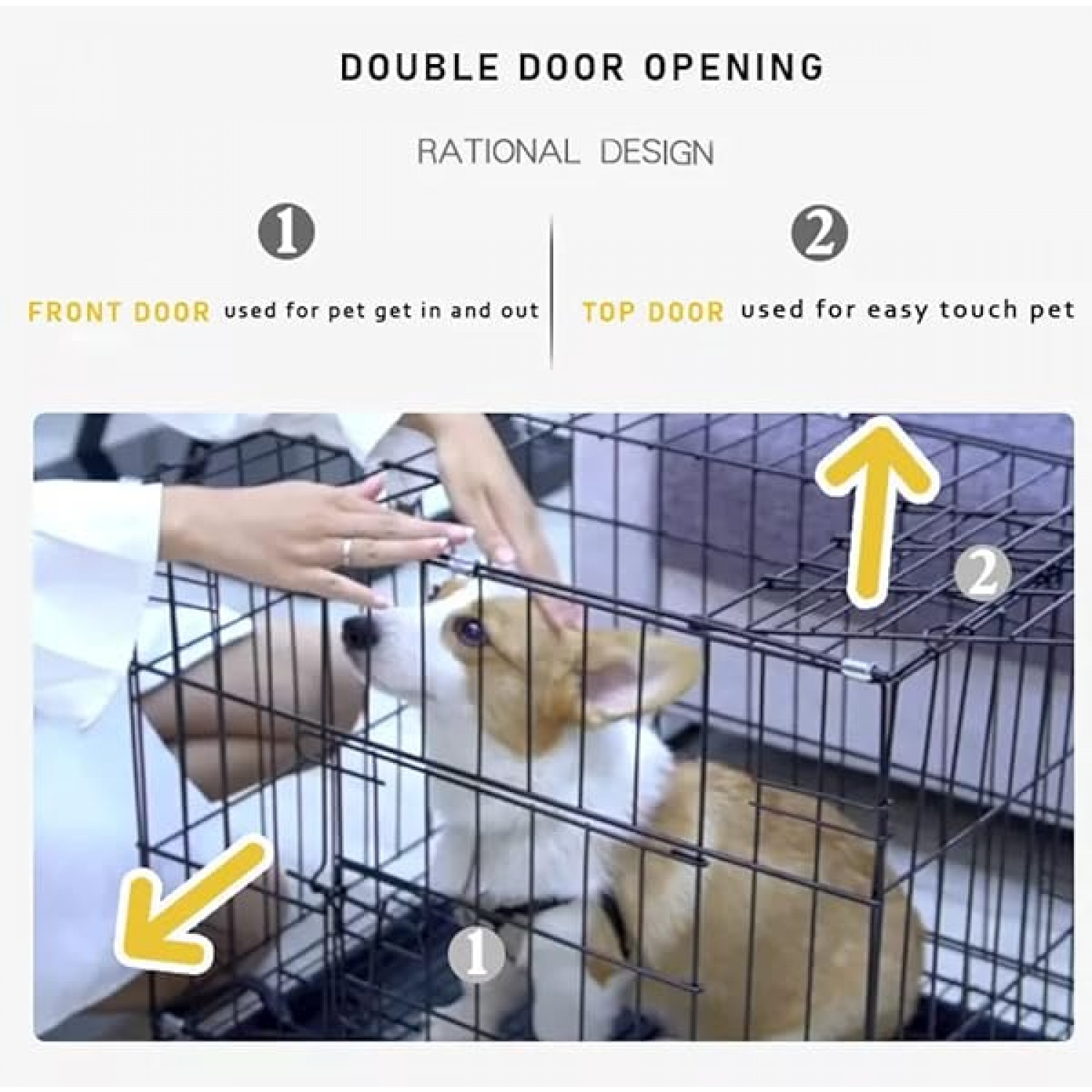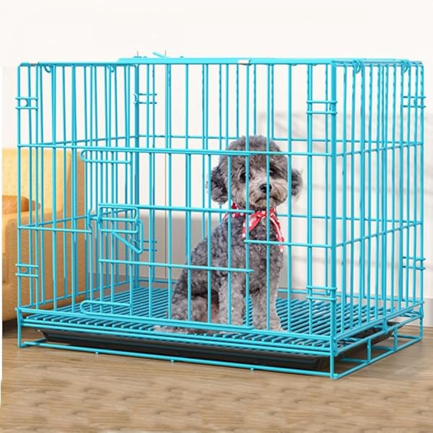 Dog crate with Double-door design for front entry and exit. Includes a removable and washable pan at the bottom of the cage.
