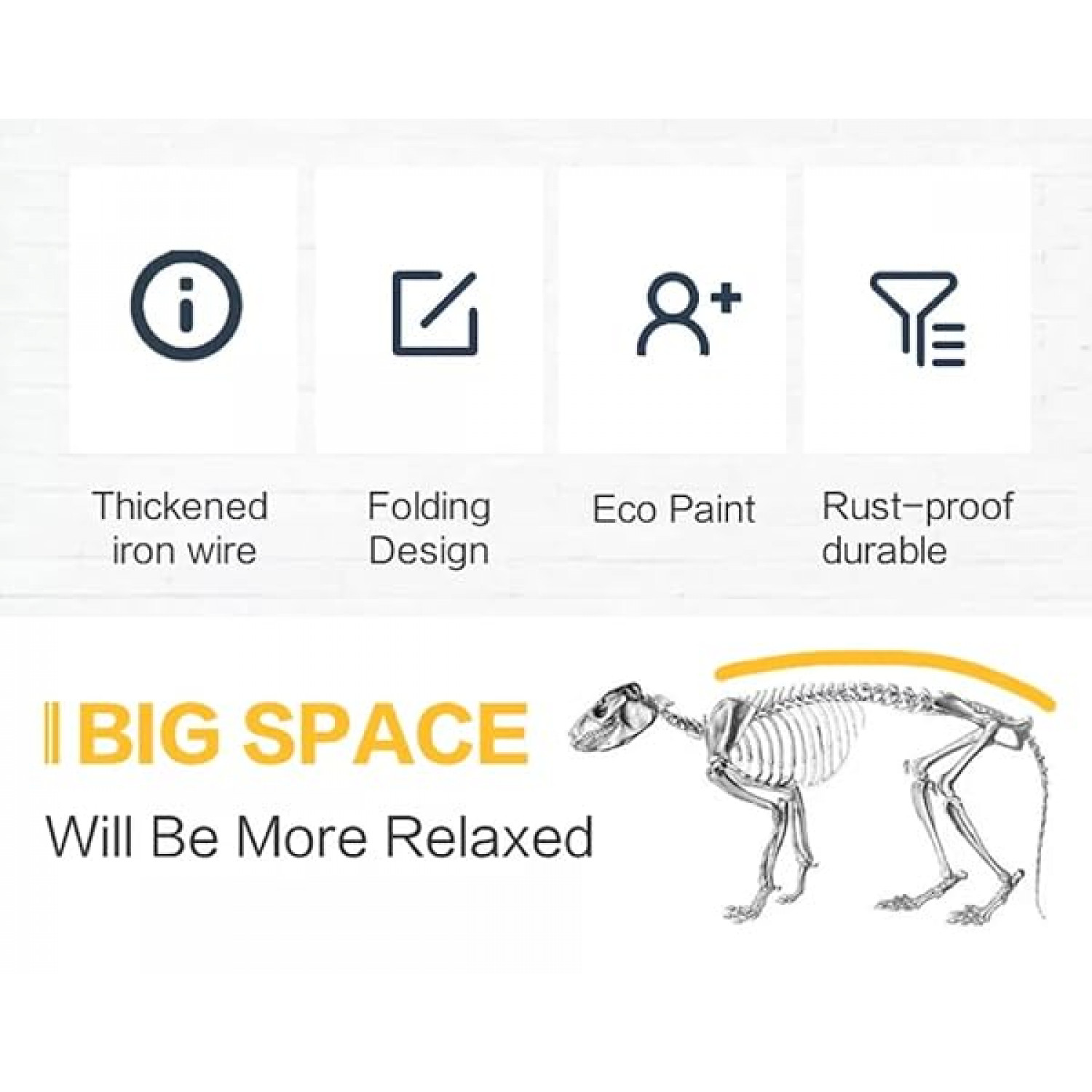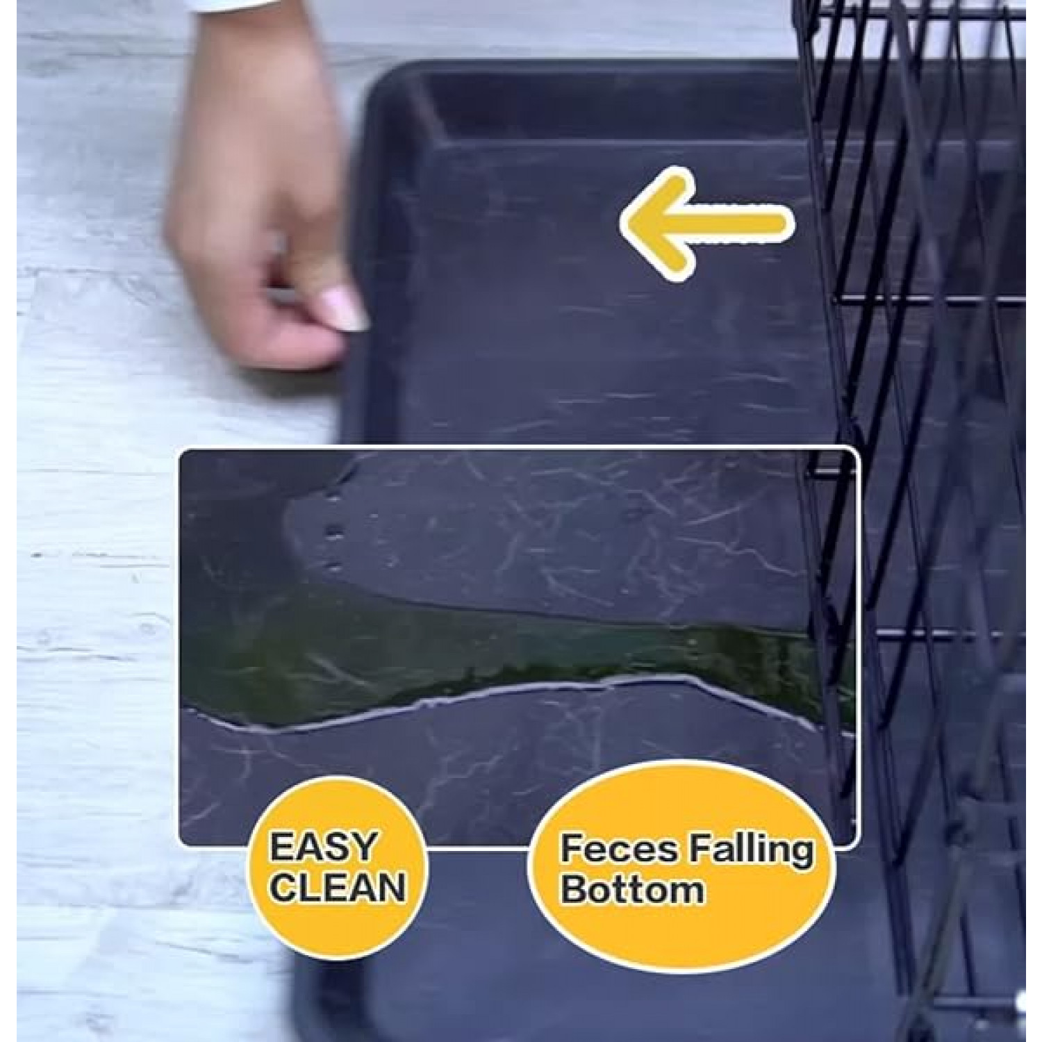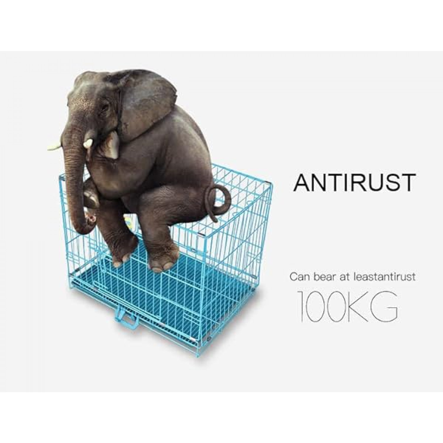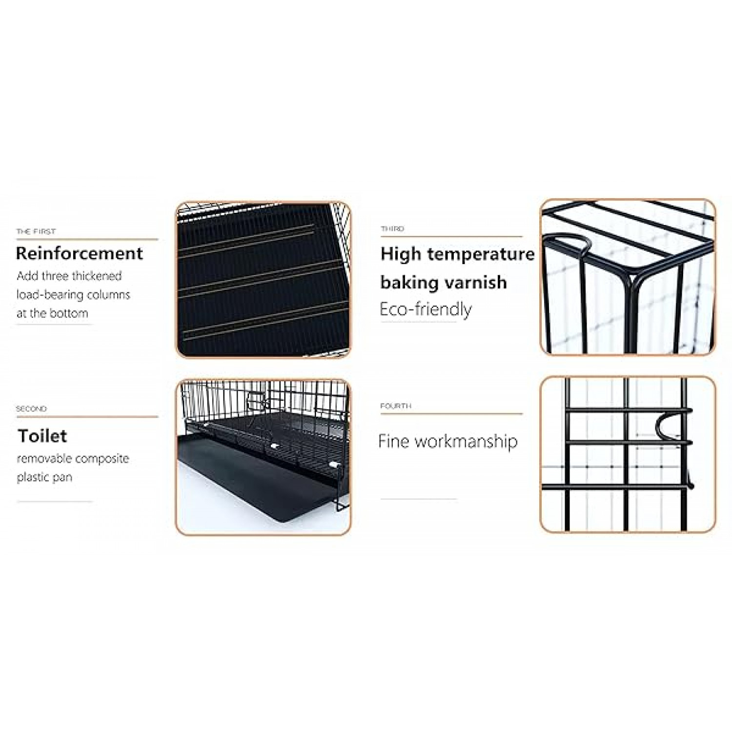 Dog crate with Double-door design for front entry and exit. Includes a removable and washable pan at the bottom of the cage.