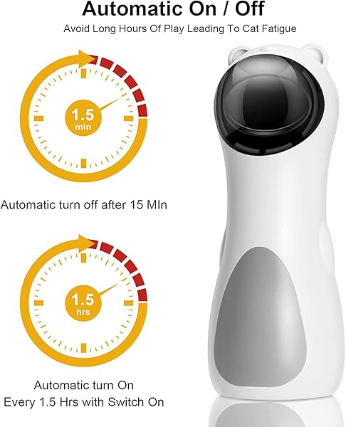 Timing Function Smart Funny Cat – Timing function Smart funny cat, smart timing play, work 15 minutes after every 1.5 hours. When in random mode the interactive cat toy automatically turns the laser off after 15 minutes to prevent your kitty from being over-stimulated and keep the game exciting.