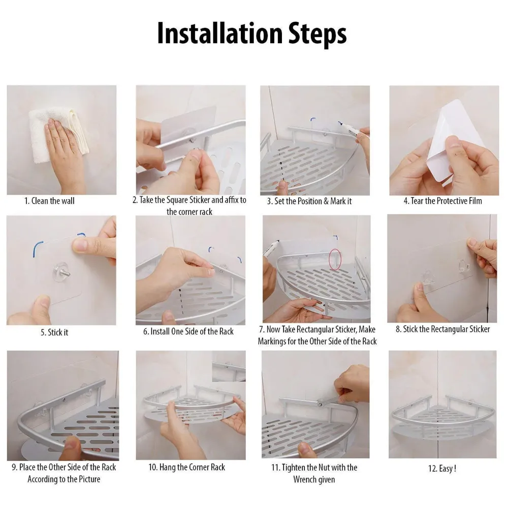 - HIGH QUALITY & RUSTPROOF MATERIAL: A sleek edge around the shelf is made specifically to prevent any falls from the shelf. Install without any tools: no screws, no nails, no glue, no more ugly holes. Shower shelf works perfectly in smooth, clean and dry ceramic tile, glass, fibre.