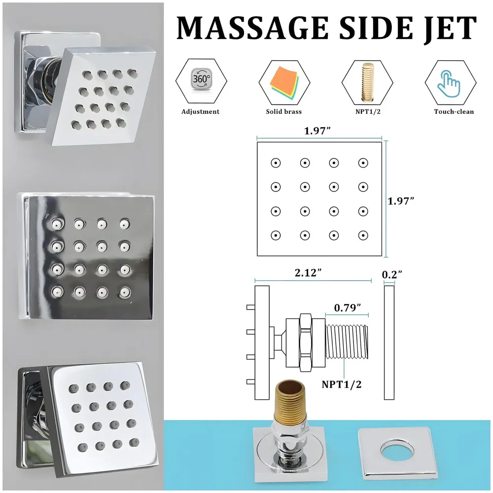 - Set of 2 Pieces SIZE: Length 5cm( 2inch )* Width 5cm( 2inch). The size is marked on the picture. Chrome Finish, create a bright, cool grey metallic look, scratch resistant and super durable. Horizontal Spray Massaging Head, Adjustable Spray Face. Up, down, left, right rotation direction CONCEALED INSTALLATION: Only shower Is visible