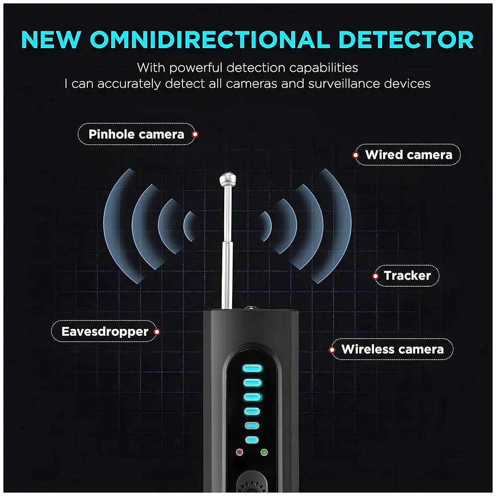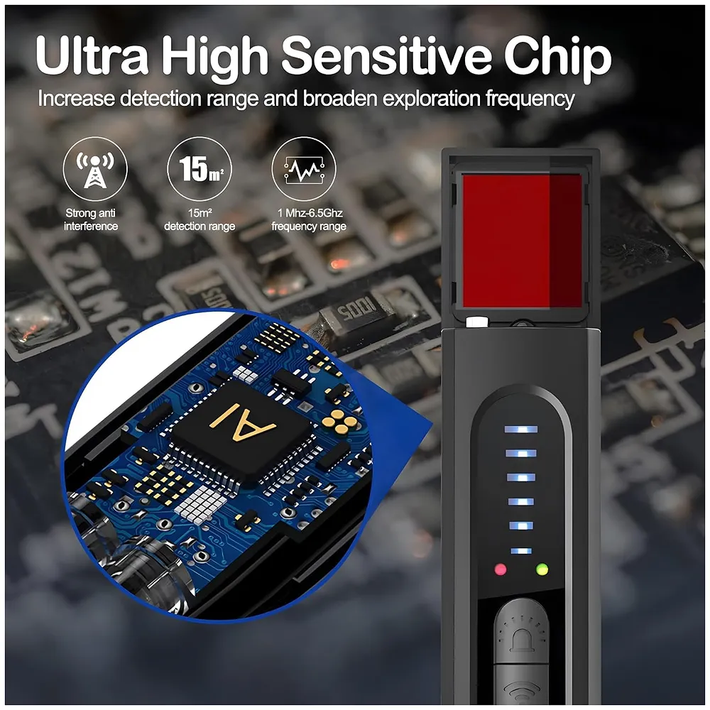 - Excellent signal detection: You can detect wireless waves, 2G mobile signals, 3G, 4G, and SIM card errors. The frequency detection range is 1MHz-6.5GHz. Help you trust your surrounding environment Ultra-sensitivity: With an improved ultra-sensitivity chip, the camera detector has 5 sensitivity levels and can accurately locate the signal source. 300 square Feet effective detection range