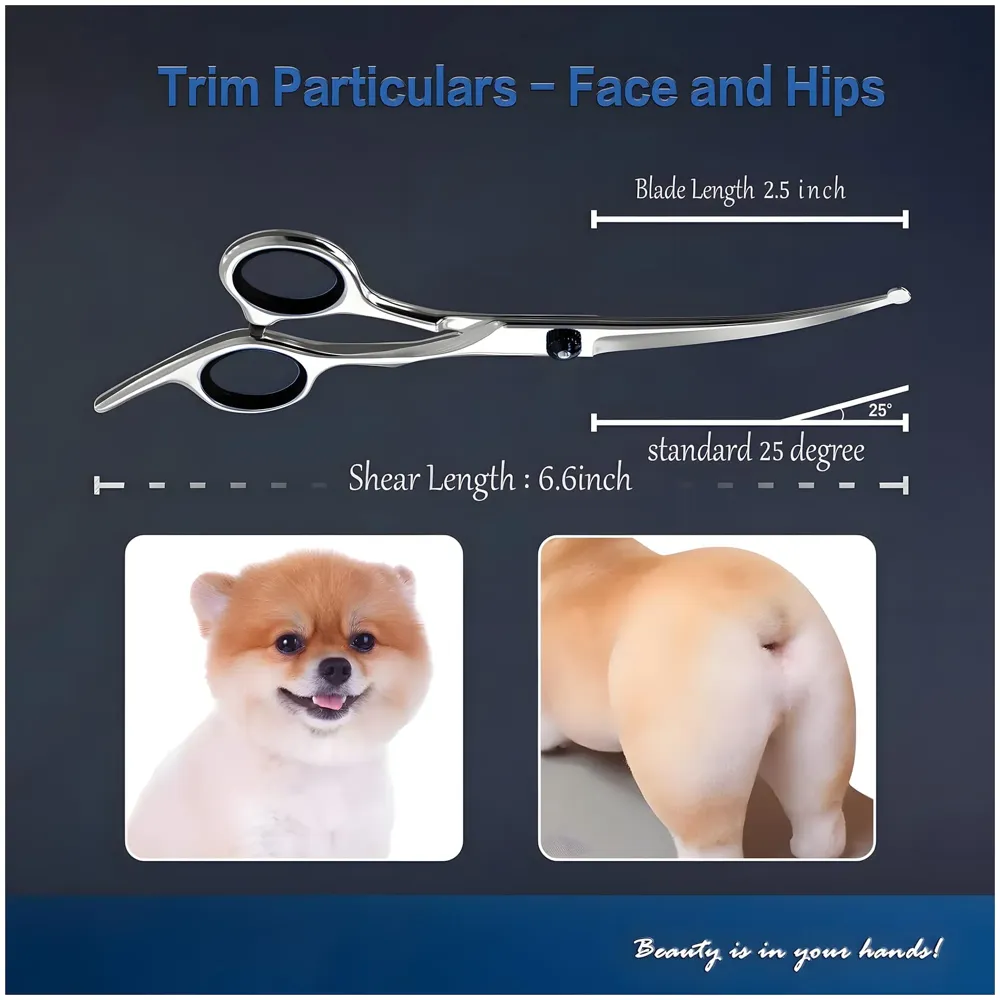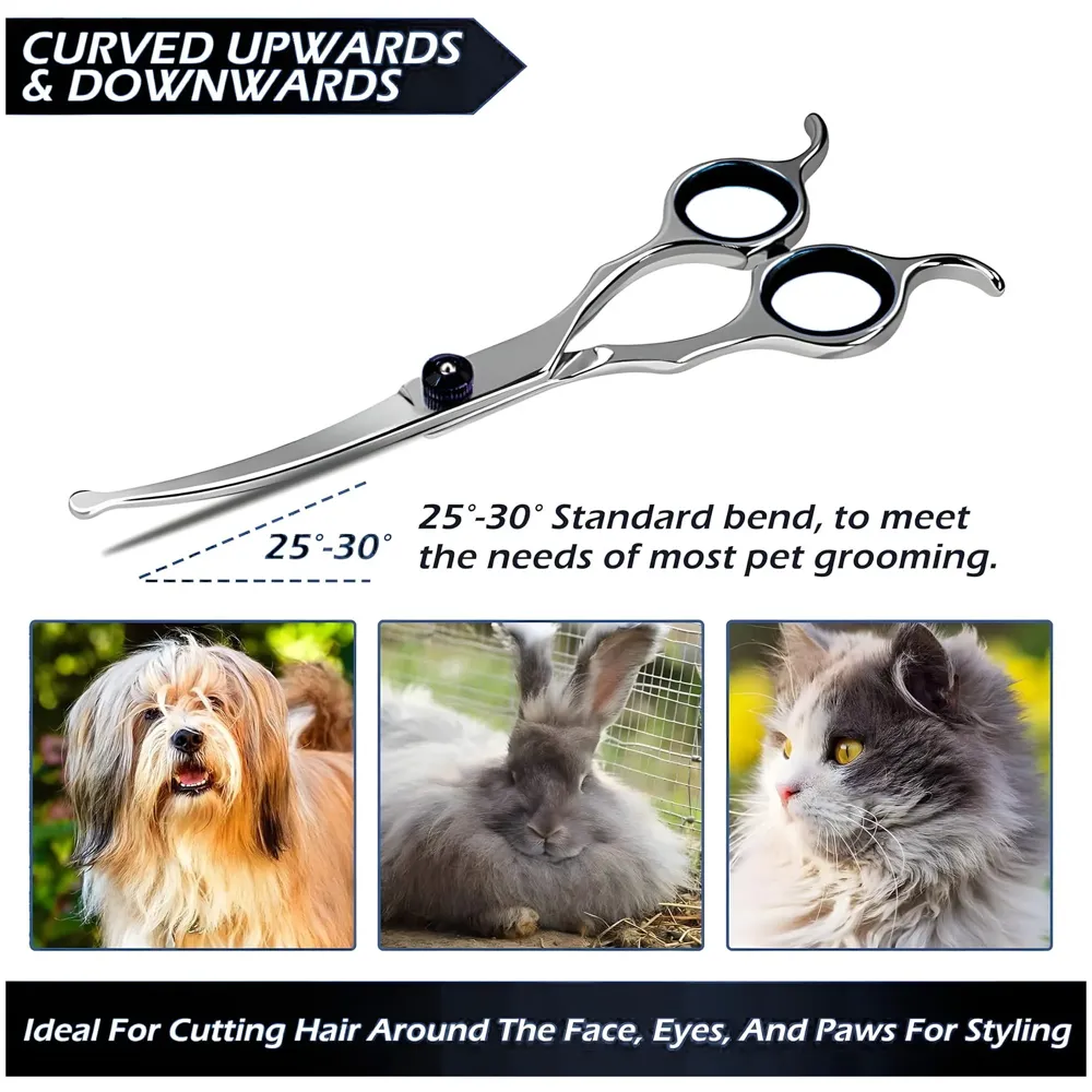 - Both Curve Up & Curve Down Scissors - The curved dog grooming shears can be used upward or downward without having to change scissors. The curved up shears can trim the hairs around your pet's eyes, ears, paws and make it looks more natural and beautiful. And the curved down scissors can make cute styles based on the shapes of your pet's face and head.