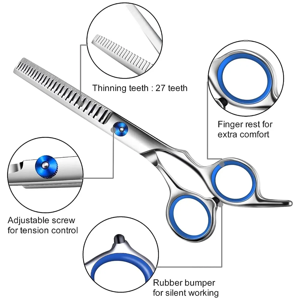 - 5 PCS Dog Grooming Scissors : Comes With 1 X 4.5-Inch Straight Scissor, 1 X 6.5-Inch Straight Scissor, 1 X 5.5-Inch Thinning Scissor, 1 X 6.5-Inch Curved Scissor, 1 X 6.5-Inch Stainless Steel Comb And One Storage Case. Perfect For Trimming Ears, Limbs, Paws, And Collar’s Hair. Quality Material : Made Of Stainless Steel Quality Material, The Scissors Are Rustproof, Durable, Functional, And Very Sharp To Use, Quickly And Easily Trim Thick Long Hair Without Irritating Pets'' Skin.