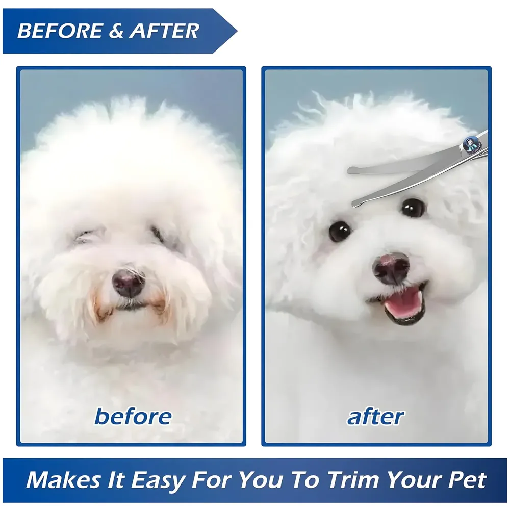 - Both Curve Up & Curve Down Scissors - The curved dog grooming shears can be used upward or downward without having to change scissors. The curved up shears can trim the hairs around your pet's eyes, ears, paws and make it looks more natural and beautiful. And the curved down scissors can make cute styles based on the shapes of your pet's face and head.