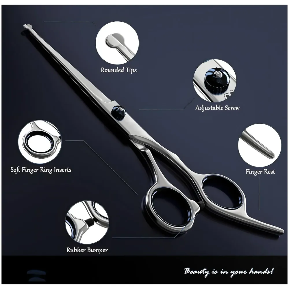 - Safe Round Head - This professional curved dog grooming scissors is designed with round tips, so don’t worry about hurt the pets in accident, especially when grooming the sensitive areas like the eyes, face, nose and paws.