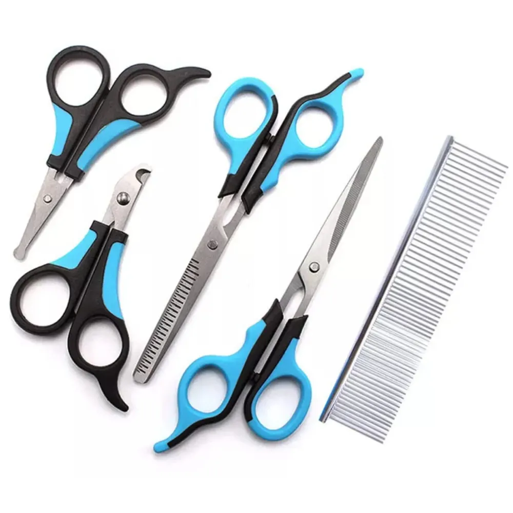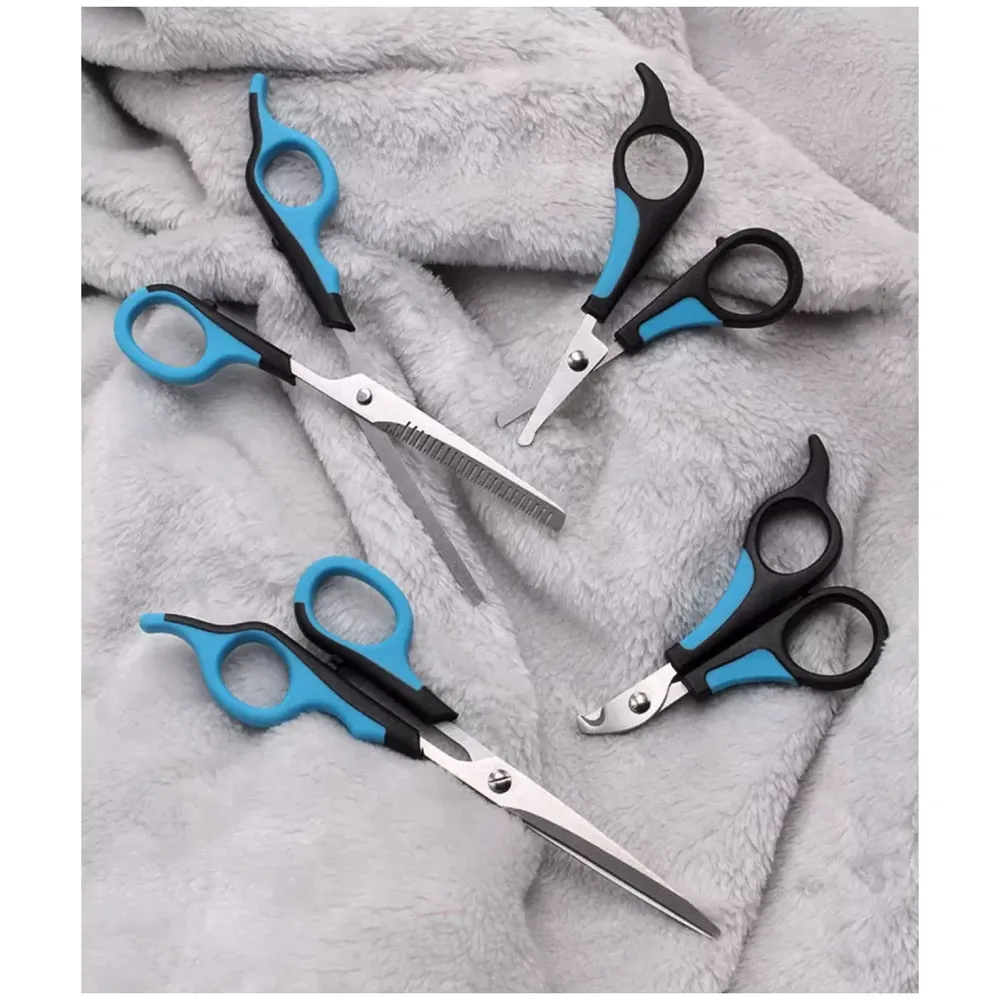 - 1. Five-piece professional grooming kit includes straight, curved, thinning, paw, and facial scissors in one set.