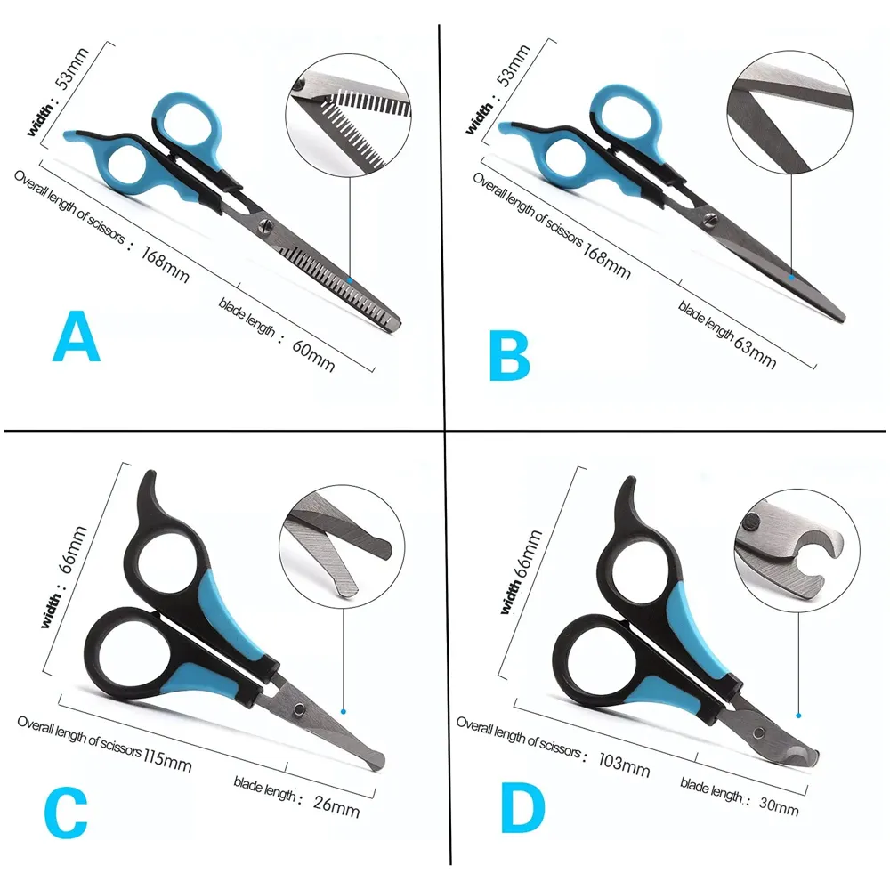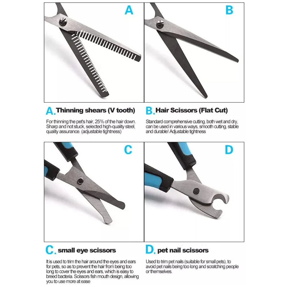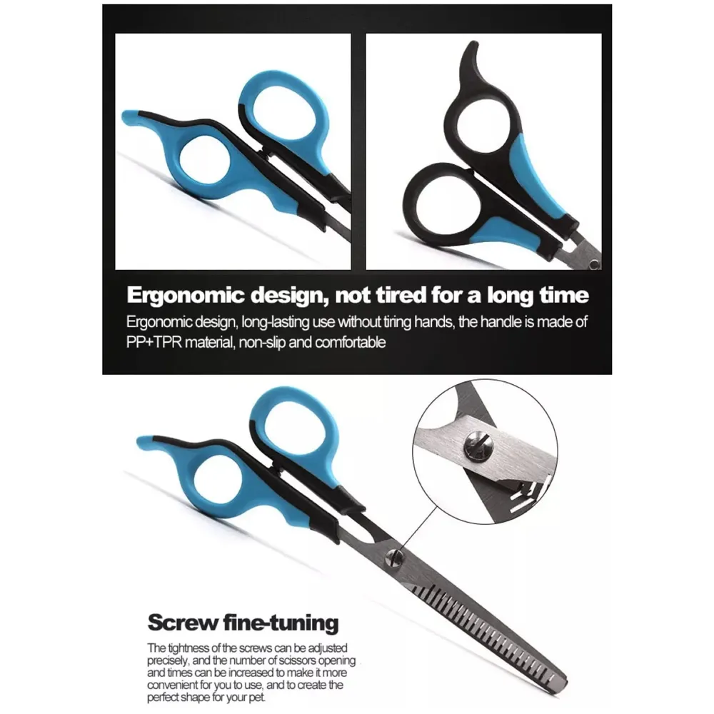 - 5 PCS Dog Grooming Scissors Quality Material : Made Of Stainless Steel Quality Material, The Scissors Are Rustproof, Durable, Functional, And Very Sharp To Use, Quickly And Easily Trim Thick Long Hair Without Irritating Pets'' Skin. Comfortable Grip : Ergonomic Design Scissors, Easy To Operate And Control, Allows The Hand To Be Held At The Most Comfortable Angle, Not Hurting Fingers After Long Time Usage. Finger Rings Are Detachable For Larger Finger Use, Enhances A Comfortable Grip.