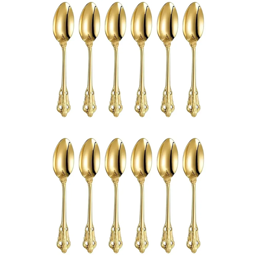 - 1. Set of 12 gold-finish mini tea spoons in a uniform 11 cm length, perfect for tea cups, coffee cups, and dessert service.